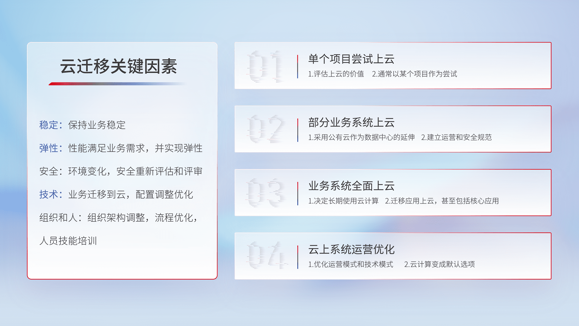 结合实际业务,,,从规划设计、、云平台选型、、、、云原生改造、、、、数据迁移、、、、集成交付,,迁移全过程为客户识别最佳上云路径,,,做好风险识别管理,,,设计网络架构、、、身份权限、、安全审计合规、、、操作审计、、日志审计、、、、监控告警策略、、、、多站点容灾设计等,,对云上基础设施进行整体规划,,,,提升IT治理水平,,以满足弹性、、、高可用、、、高性能的需求。。。