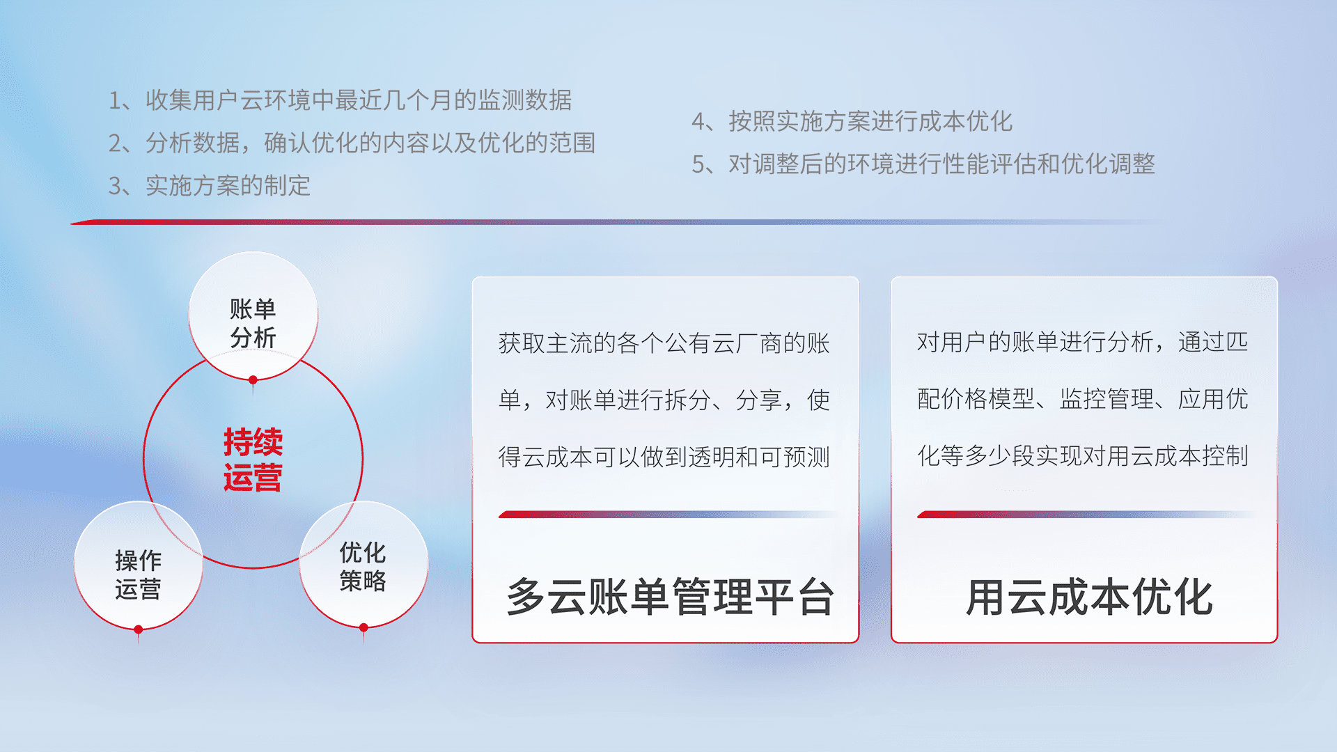 通过多云纳管,,以统一的资源数据模型把客户的云资源进行抽象和封装,,进而实现对多云资源的统一操作,,,,保障云资源管理的可靠性、、稳定性与可用性。。。。量身定制化运维内容,,,,配置、、、、开发运维、、、、补丁管理、、备份、、、、监控、、、、认证和访问管理、、、、审计和日常巡检等,,保障在用云过程中的可靠度,,,,稳定度以及高可用率。。。。